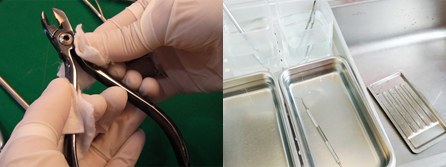 - 1회용 재료를 제외한 나머지 교정기구 및 일반기구는 사용후 소독용알코올로 깨끗이 닦은 후 소독액에 담궈 1차 소독을 시행합니다. 그 이후 소독액에서 기구를 꺼내어 깨끗이 세척해 줍니다.